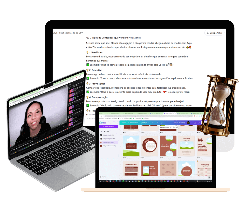 Como mãe e empreendedora, entende as dificuldades de equilibrar negócios e vida pessoal, e por isso criou um sistema que transforma a criação de posts em um processo rápido, simples e eficiente. Sua experiência permite ajudar qualquer empreendedora a se posicionar e vender todos os dias sem precisar passar horas quebrando a cabeça com design e conteúdo.